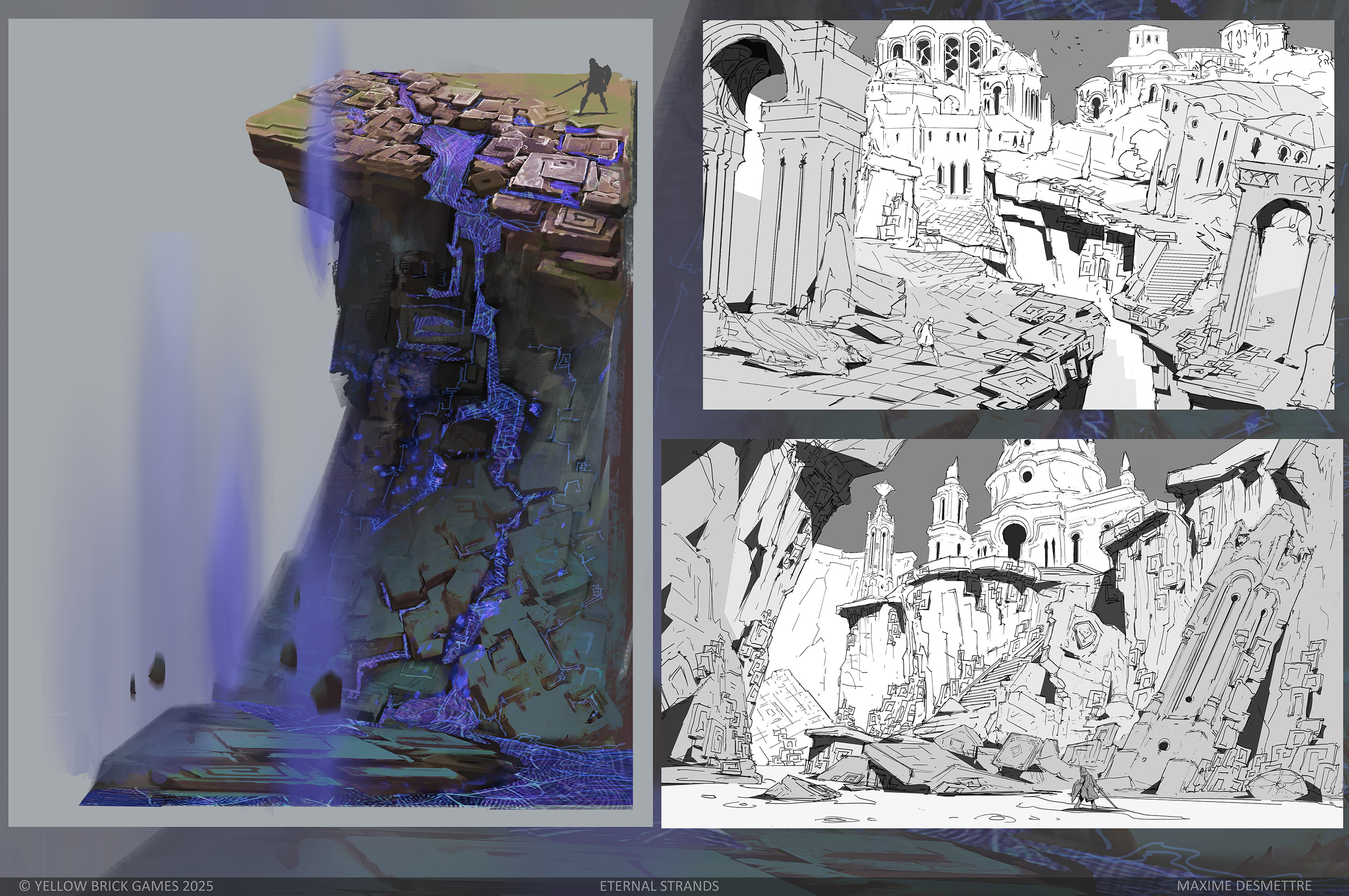 Early concept art of the underground area. Unusual rock formations to remind the magic that flows in this place, and a man-made structure in the back to show the place has been developed